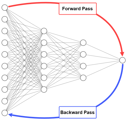 In the forward pass, we start by propagating the data inputs to the input layer, go through the hidden layer(s), measure the network’s predictions from the output layer, and finally calculate the network error based on the predictions the network made.